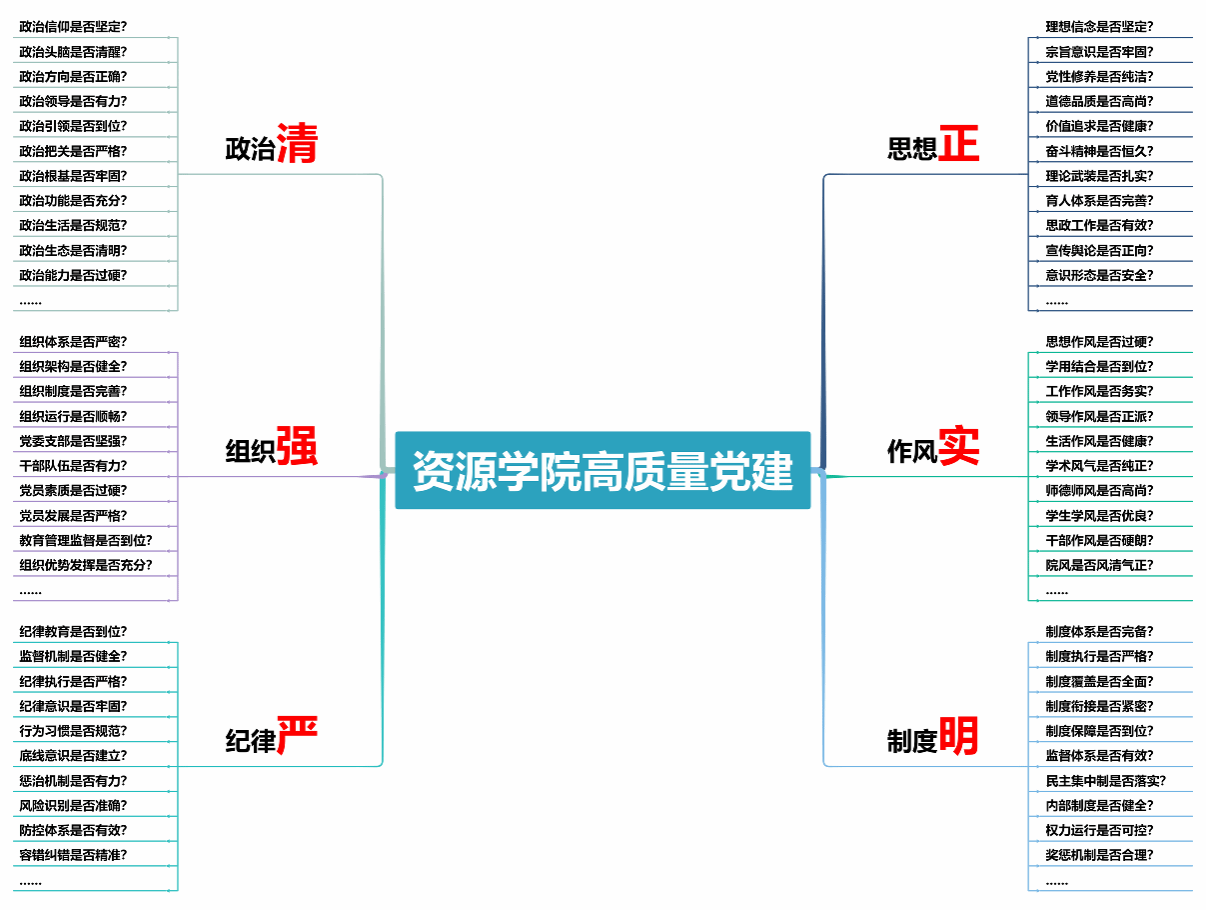 坚持科学、系统、规范原则,细化“4+12”党建工作体系,聚焦“什么是资源台湾自拍 高质量党建”关键问题,从党的六大建设入手,以“政治清、思想正、组织强、作风实、纪律严、制度明”为出发点和落脚点,探索构建了资源台湾自拍 高质量党建框架体系,开出党建“问题单”,明确“任务书”,制定“施工图”,为党建工作质量提升建立政策理论依据及实践探索基础。与此同时,通过推行台湾自拍 领导班子“三张清单”、制定台湾自拍 年度党建工作重点任务清单、构建党建制度体系等举措,逐级夯实责任,逐项抓好落实,持续提升党建工作科学化、系统化、规范化、实效化水平。